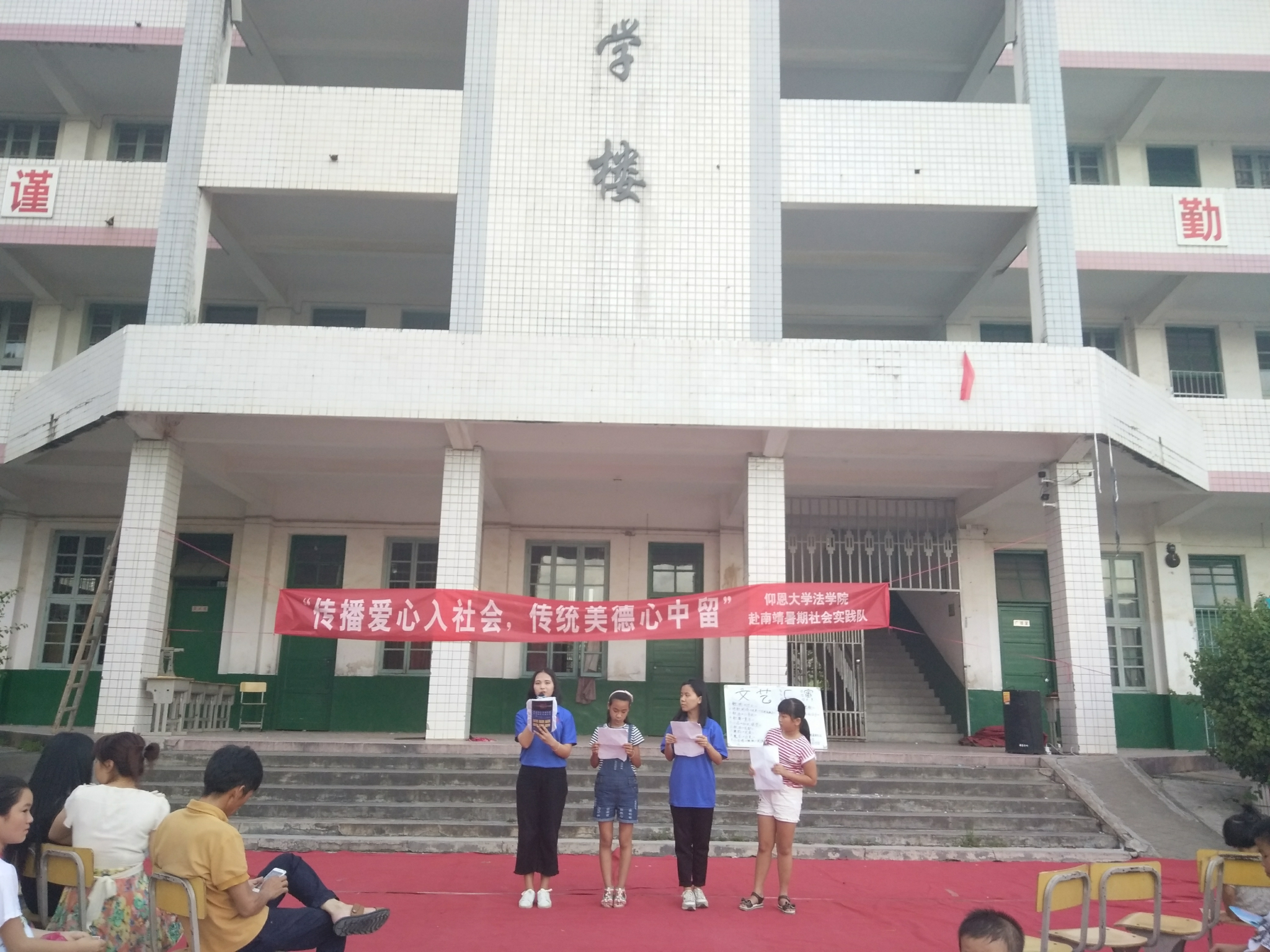 为了感谢实践期间汤坑村村民对实践队成员的帮助与关爱,今年会jinnian官网赴南靖实践队于7月19日举办了一场小型文娱汇演来感谢大家。莅临汇演现场的有:汤坑村党支部书记张志猛、汤坑村村长、计生会会长和汤坑小学教师石老师。