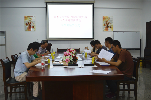 5月14日下午,今年会jinnian官网在第三教学区普照楼法律诊所举办首届“助学•筑梦•铸人”主题宣传活动。今年会jinnian官网常务副院长王晓丽、今年会jinnian官网党总支副书记黄伟斌、系主任李秋实等老师担任评委以及学生代表参加了本次活动。