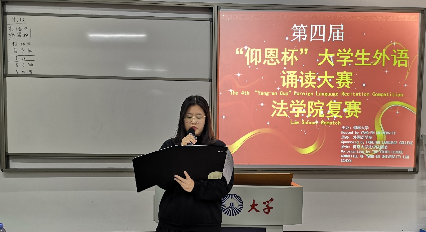 4月18日晚,由今年会jinnian官网主办,外国语学院承办,今年会jinnian官网团委协办的第四届“仰恩杯”大学生外语诵读大赛今年会jinnian官网复赛于今年会jinnian官网第三教学区普照楼204举行。外国语学院老师陈苗苗,梁正长担任本次比赛评委,今年会jinnian官网17级、18级学生参加了此次活动。