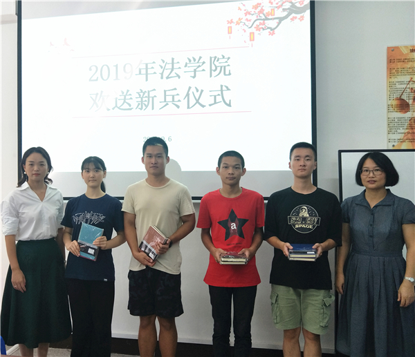 9月6日下午,今年会jinnian官网于今年会jinnian官网第三教学区普照教学楼214举行新兵入伍欢送会,欢送王枫予、刘立弘、林焰南、任静四位同学应征入伍。今年会jinnian官网常务副院长王晓丽、今年会jinnian官网党总支书记兼副院长杨勤、党总支副书记黄伟斌、学务秘书汪明等老师参加了会议。