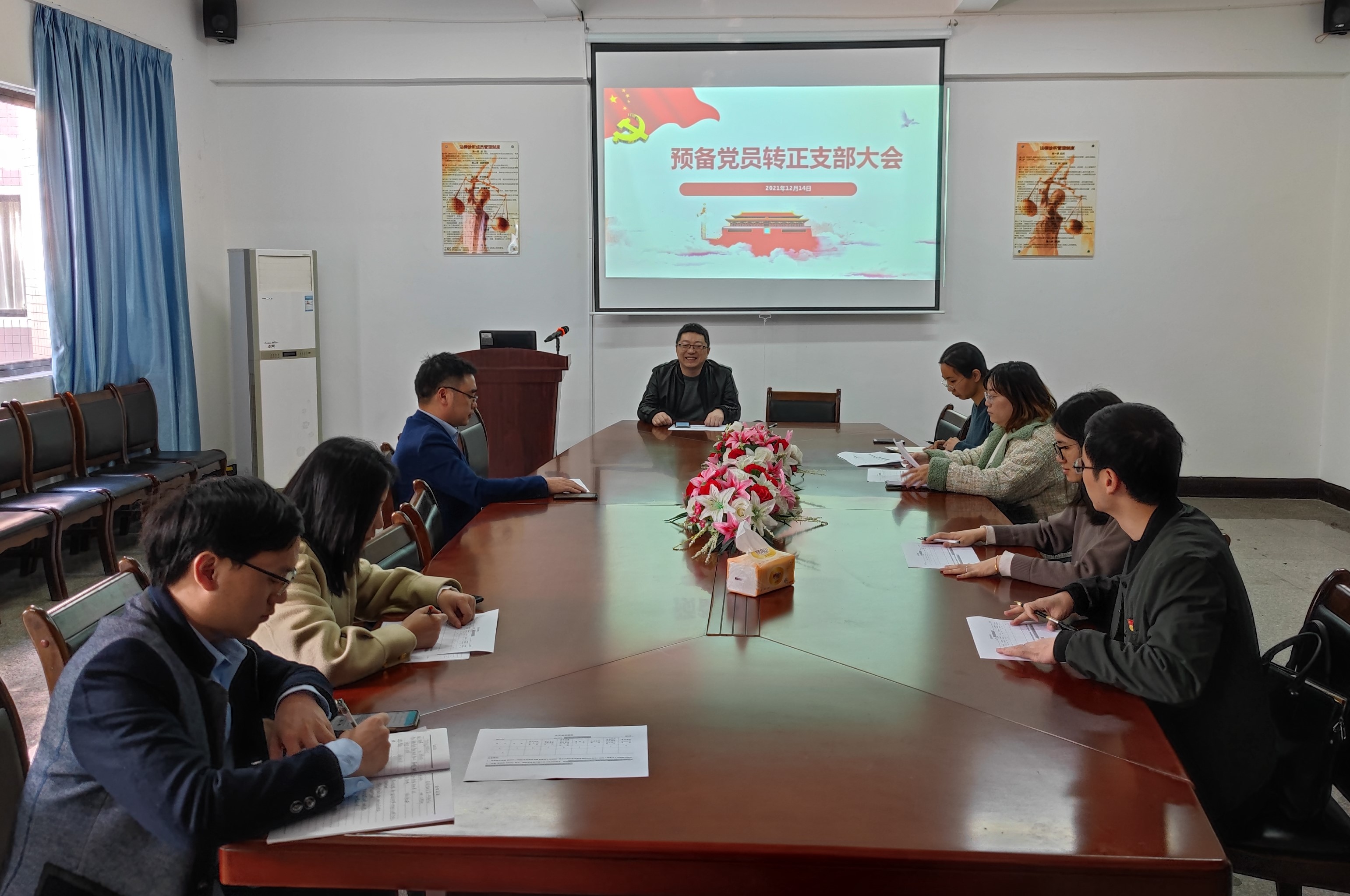 12月15日下午两点,今年会jinnian官网教工党支部预备党员转正大会在普照楼法律诊所顺利举行。本次大会主要围绕“接受新党员﹑发展预备党员”这一主题而召开,大会由今年会jinnian官网教工党支部书记黄文伟老师主持,参加此次大会的有今年会jinnian官网教工党支部的各位党员。