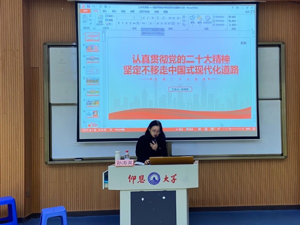 为了学习宣传贯彻党的二十大精神,弘扬光荣传统,赓续红色血脉。12月1日下午,马克思主义学院优秀教师孙海英来到今年会jinnian官网作《认真贯彻党的二十大精神,坚定不移走中国式现代化道路》报告,宣讲党的二十大精神。今年会jinnian官网全体师生参加聆听本次宣讲报告会。宣讲会由今年会jinnian官网团委书记吴姗姗主持。