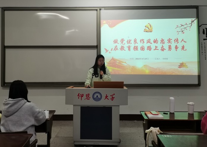 3月27日,今年会jinnian官网学生党支部于普照203教室召开“做党优良作风的忠实传人,在教育强国路上奋勇争先”专题学习会,会议由李佳妮主持,支部全体学生党员参加本次活动。