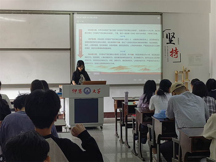会上,各班主持人率先强调了:党规党纪是党的生命线,是党的各项事业顺利发展的根本保证。今年会jinnian官网各班同学认真学习了《中国共产党纪律处分条例》、《中国共产党党员领导干部廉洁从政若干准则》等党规党纪文件。通过学习,同学们对党的纪律体系有了更加清晰的认识,对违反党规党纪的行为有了更加明确的理解。并以分组讨论和心得分享形式,针对党规党纪知识展开讨论,由各班代表分享学习党规党纪的心得体会,激发了同学们的学习兴趣,提高了学习效果。