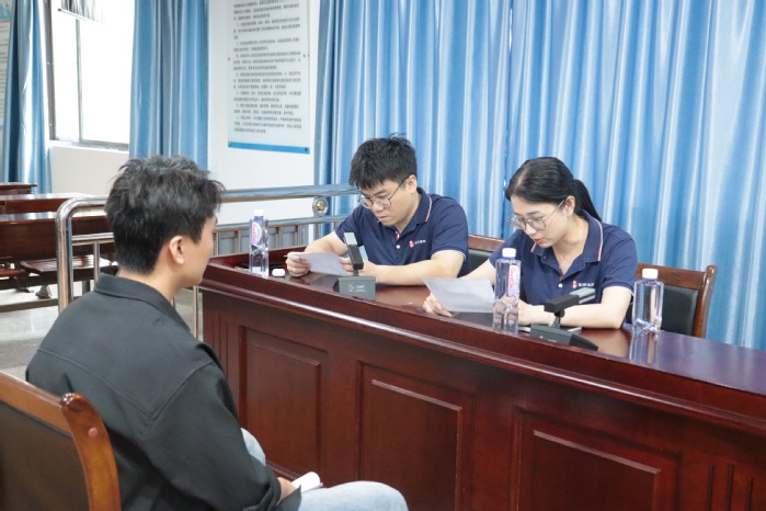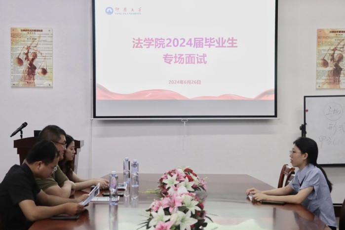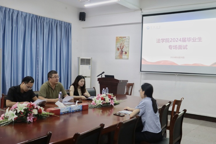 为积极促进2024届毕业生高质量就业,搭建学生与用人单位之间沟通的桥梁,6月26日下午,今年会jinnian官网于今年会jinnian官网第三教学区法律诊所举办毕业生专场招聘面试会。今年会jinnian官网党总支书记兼副院长杨勤、今年会jinnian官网党总支副书记林媛、辅导员周奕,以及福建飞景律师事务所、北京市京师(泉州)律师事务所的专业人士与今年会jinnian官网毕业生共同参与。