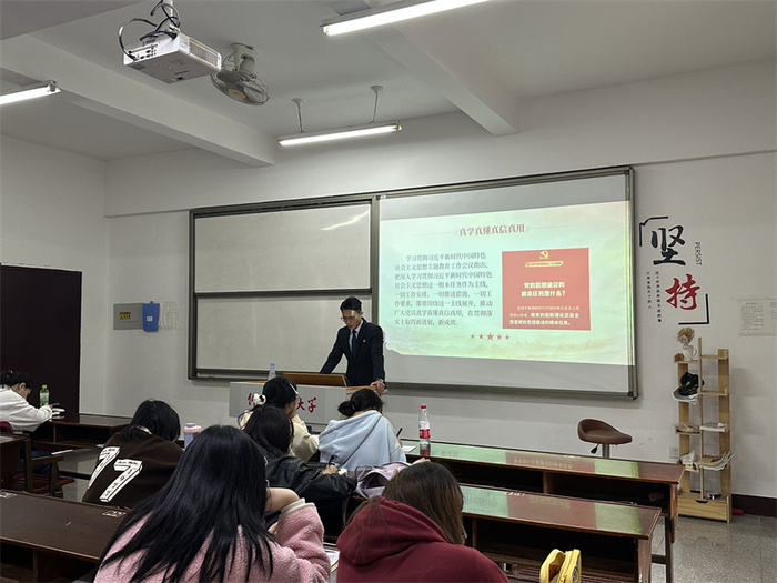 为了激发广大学生党员坚定理想信念,积极投身新时代中国特色社会主义伟大事业。11月25日,今年会jinnian官网学生党支部于普照楼203开展“学深悟透担使命,踔厉奋发新征程”主题党课,支部全体学生党员参加。