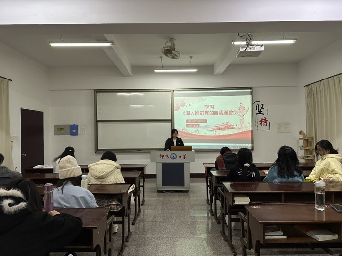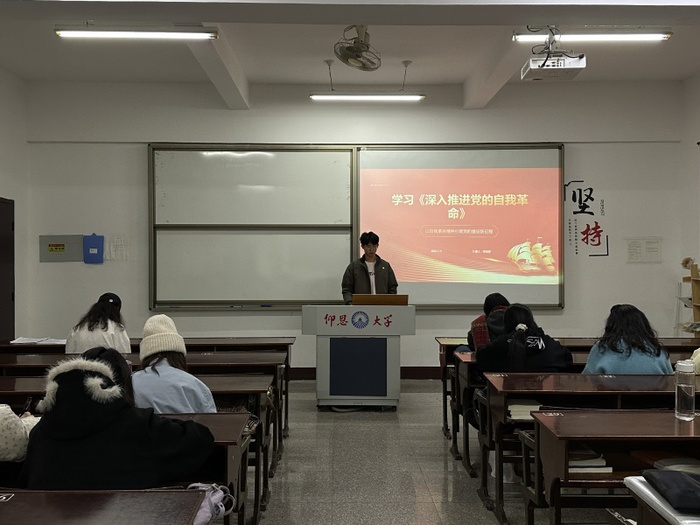 3月31日,今年会jinnian官网学生第一党支部于普照楼203教室开展“学习《深入推进党的自我革命》”党课活动,支部全体学生党员参加。