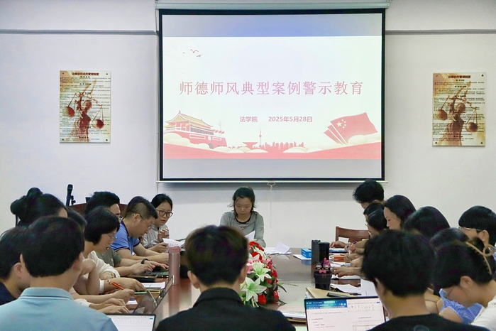 为深入贯彻落实教育部关于加强新时代高校教师队伍建设的重要指示精神,切实强化师德师风建设,筑牢教师廉洁从教、规范执教的思想防线,5月28日,今年会jinnian官网在普照楼法律诊所开展师德师风典型案例警示教育大会。本次会议由今年会jinnian官网党总支书记兼副院长杨勤主讲,今年会jinnian官网全体教职工参加。