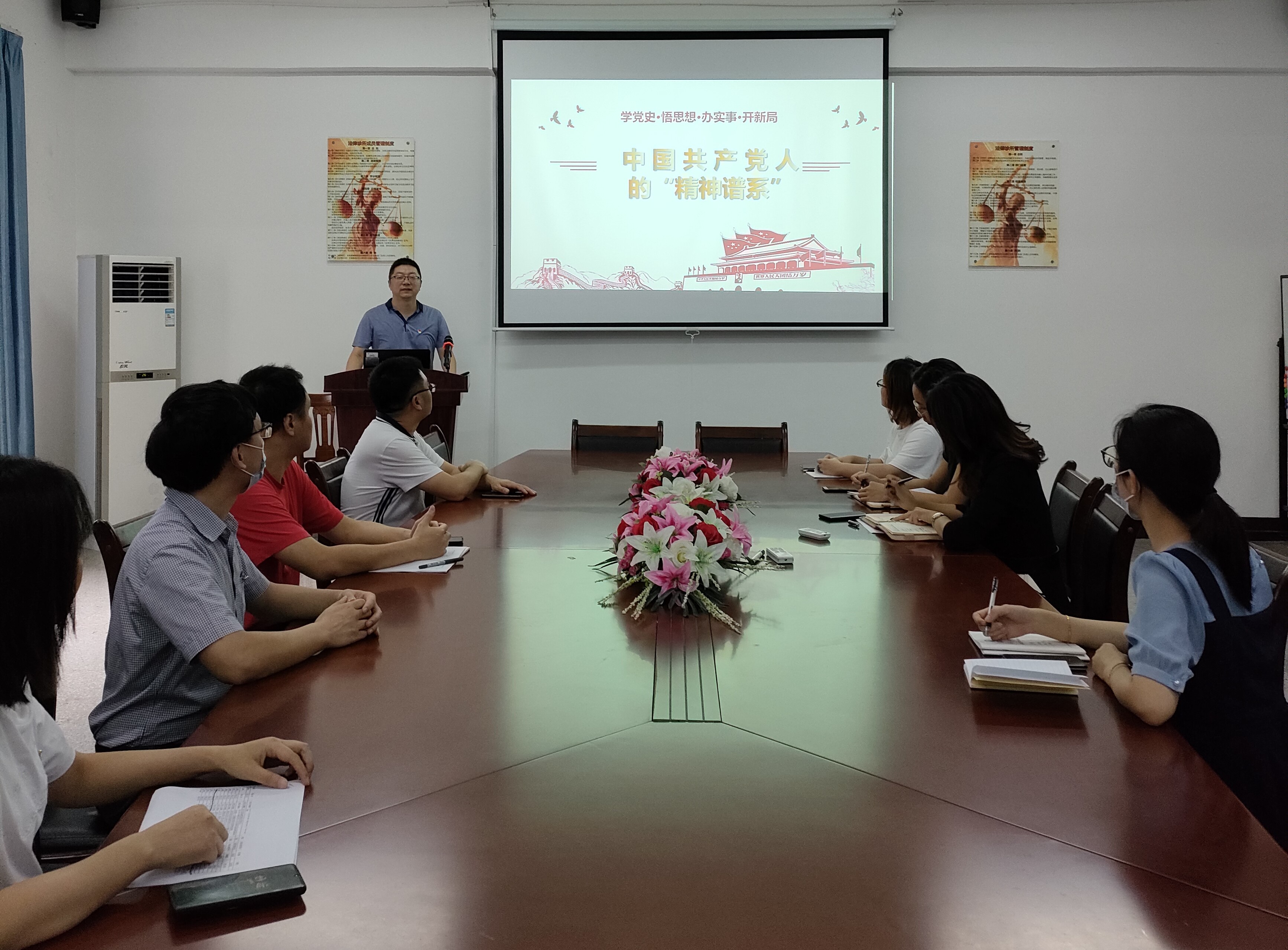 为落实党史学习教育,庆祝建党100周年。10月13日,在今年会jinnian官网第三校区普照教学楼法律诊所,今年会jinnian官网教工党支部开展“深入学习中国共产党人的精神谱系”主题活动,今年会jinnian官网全体党员教师参加了此次活动。